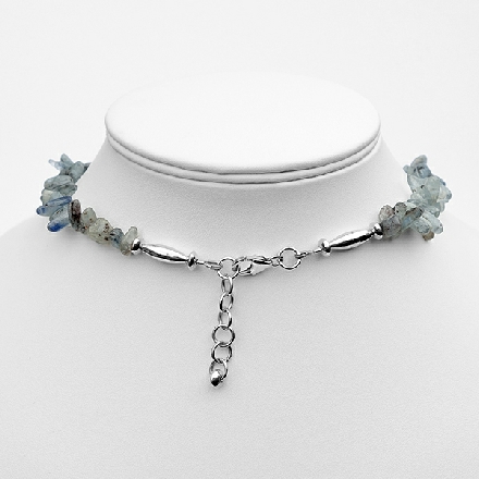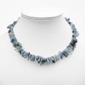 A simple strand of long kyanite chips in ocean blues with black inclusions, a beautiful natural necklace finished with sterling silver saucers and a couple of long olive shaped beads and carabiner clasp.  The earrings are made with the same kyanite chips, small sterling silver saucers and wire hoops on oval lever backs.