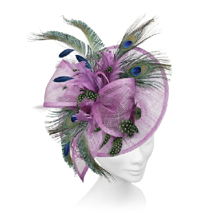 Stunning sinamay saucer fascinator. The bow detail gives way to peacock eyes and swords, with a lavish array of other assorted feathers draping beautifully over the brim. An exotic statement headpiece!