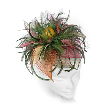 A feminine feathery flower fascinator which is luscious and light. Rolled edge sinamay petals curve gently around the head. The gathered netting diffuses the edge and softens the overall look.