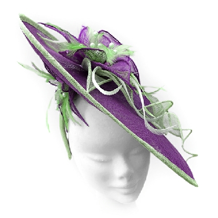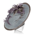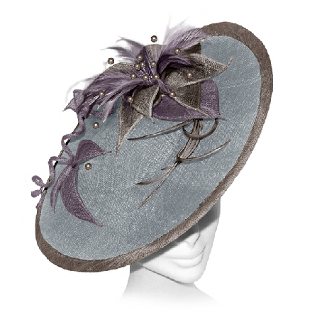 A large disc fascinator with contrasting trim, decorated with sinamay flowers and leaves. Feathers and crystals form the centre of the floral decoration which is echoed under the brim. The handmade trim continues as it cascades along the front amidst a sinamay swirl.