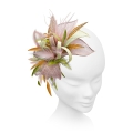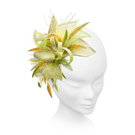 Exquisitely feminine fascinator. Rolled edge sinamay leaves sweep up from a base of narrow loops. Curled goose biots and other exotic feathers add interest and soften the look.