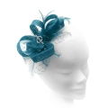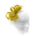 Wonderful whorls of sinamay ribbon wind round in loops to form this asymmetrical design fascinator. Wispy feathers extend out daintily, while crystals and a touch of netting add glamour.