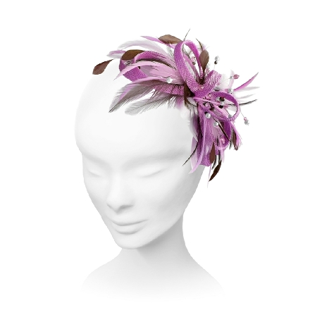 Beaded beauty. Gentle loops of sinamay sweep beneath a cluster of beads in this pretty fascinator. Stripped coque, biot and hackle feathers combine to add interest and softness.