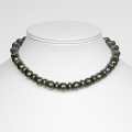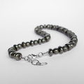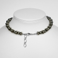 This necklace is a single strand of iron pyrite rondelles and round beads, 1" round and oval link extension chain and sterling silver carabiner clasp.