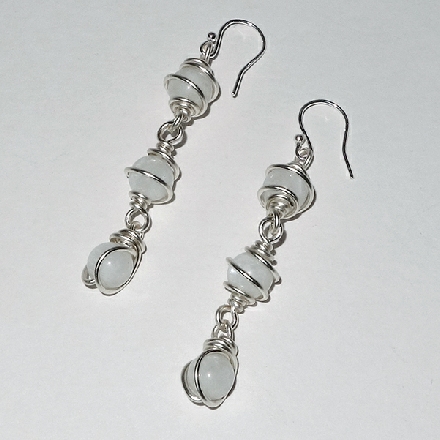 White moonstone round beads are wrapped with silver plated wire to form the links in these handmade chain earrings.