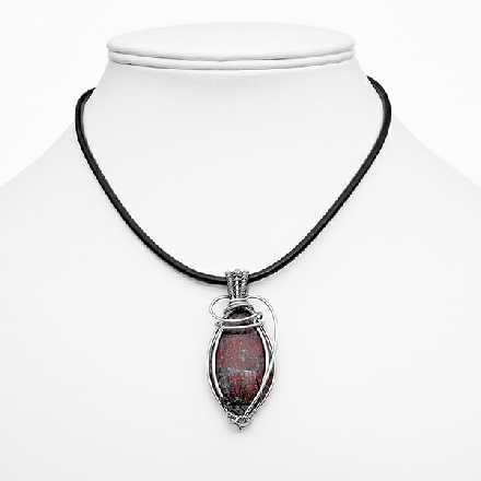 An amazing pendant created from a wonderful rare Spiderweb Jasper cabochon. The rugged colouring in red, grey and black is perfectly complimented by the titanium plated wire sculpted around it.