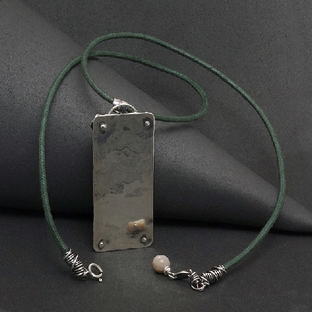 A striking colourful Ocean Jasper stone in soft shades of pink, green, beige, yellow and white; held securely onto a textured silver base. The silver has been lightly oxidised to add depth and character, and the soft cotton cord is finished with an ocean jasper bead.