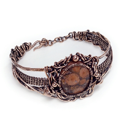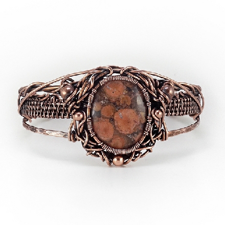A unique intricately woven one of a kind bracelet. The focal stone is a hand-cut and polished Poppy Jasper in soft autumnal shades of orange, peach and brown.