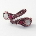 Antique copper coloured wire ring with pale frosted rose quartz and rhodonite round beads.
