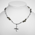 A pretty, delicate necklace made a little more substantial by the addition of iron pyrite faceted and round beads and labradorite chips.  The dainty dragonfly dances around on a sterling silver curved tube between two sterling silver rondelles.  Tiny sterling silver rondelles separate the gemstone elements and the chain is brought together with sterling silver round and oval links.