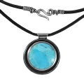 This stunning Kingman Turquoise stone with its multi-toned distinctive pattern is set in sterling silver which has been oxidised to give a dark background contrast to the polished silver.