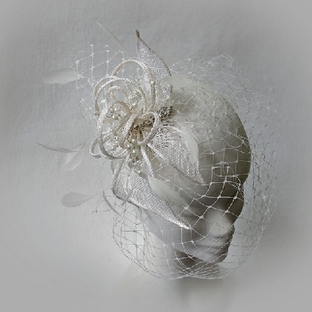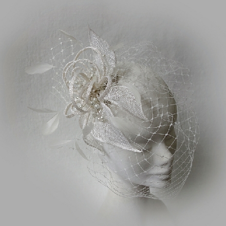 Perfectly pretty sinamay flower fascinator with loops and feathers. Crystal pearls adorn the centre from which falls a softly gathered veil. This fascinator is available with or without the veil.