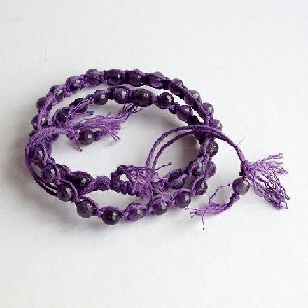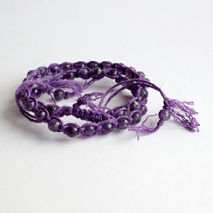 Purple toned sage amethyst faceted beads are knotted together with hemp cord creating a lovely double wrap adjustable casual bracelet.