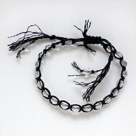 The finest sparkly clear crystals are knotted together with black hemp cord in this adjustable casual 8mm wide friendship style bracelet.