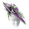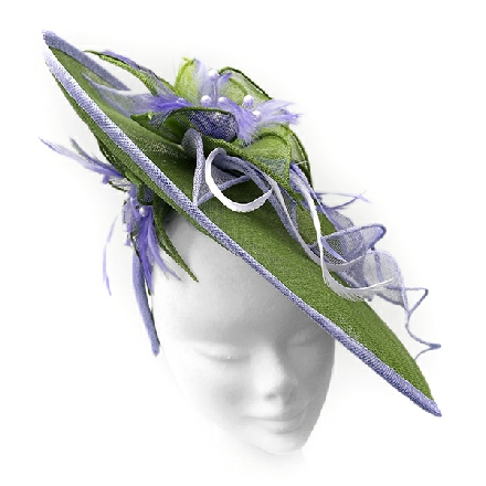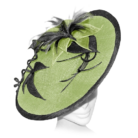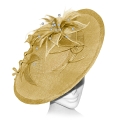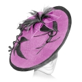A large disc fascinator with contrasting trim, decorated with sinamay flowers and leaves. Feathers and crystals form the centre of the floral decoration which is echoed under the brim. The handmade trim continues as it cascades along the front amidst a sinamay swirl.