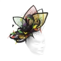 Show stopping vibrant sinamay fascinator. The loops and petals are echoed by stripped coque feathers, while the netting detail adds further texture. An exotic statement headpiece!