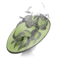 Elegant and sophisticated. A large wide brimmed fascinator with contrasting trim, decorated with flowers and leaves. Feathers and crystals add an extra dimension to this impressive piece.