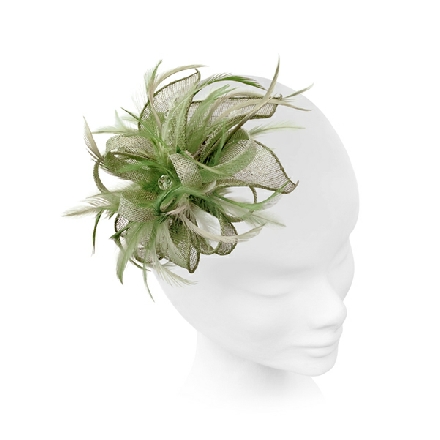 Exquisitely feminine fascinator. Rolled edge sinamay leaves, delicately veined with clear crystals, sweep up from a base of narrow loops. Curled goose biots add interest and soften the look.