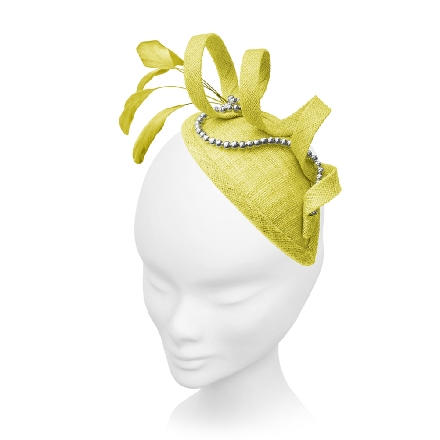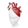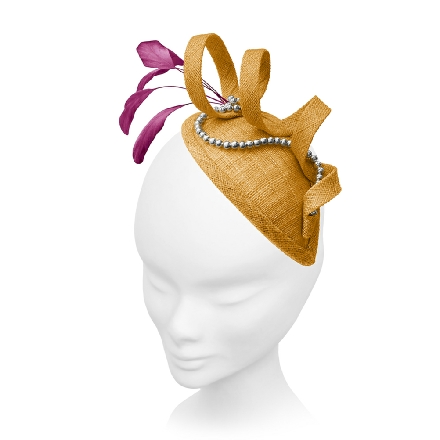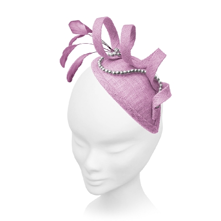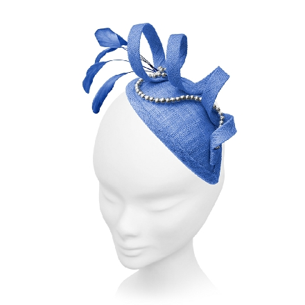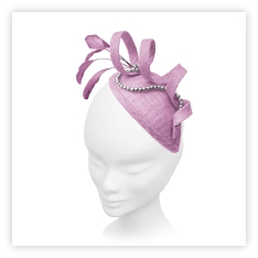 Simply sculptured on a sinamay teardrop base, this fascinator spirals upwards to enclose elegant stripped coque feathers. A fluid strand of pearls weaves in and out of the design.