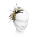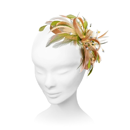 Beaded beauty. Gentle loops of sinamay sweep beneath a cluster of beads in this pretty fascinator. Stripped coque, biot and hackle feathers combine to add interest and softness.