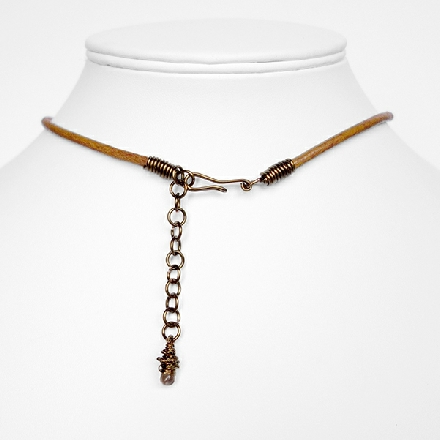 The 3 mm supple tan Greek leather cord is 17” with a 2” extension chain finished with a genuine wire wrapped smoky quartz drop.