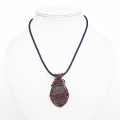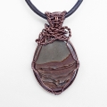 A fabulous and very rare hand cut Deschutes Scenic Jasper cabochon, beautifully wrapped in copper wire. The pendant measures 35 x 60 mm and is strung on 3 mm supple dark brown Greek leather cord measuring 17” with a wire hook closure. There is also a 2” extension chain finished with a smoky quartz wire wrapped drop.