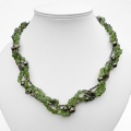 A fabulous colour, this stone reminds me of treks through the jungle.  Three strands of peridot chips, iron pyrite nuggets and round beads, and an oxidised silver chain entwine in this pleasingly weighty chunky necklace.