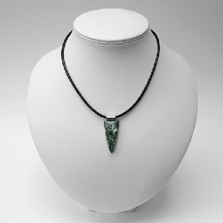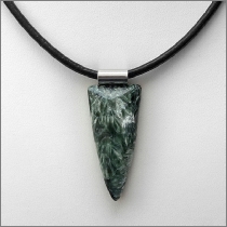 A simple unisex seraphinite pendant hung from a chunky sterling silver bail on a black leather cord.