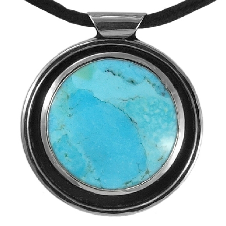 It is hung on a black leather 18” cord with sterling silver hook clasp.