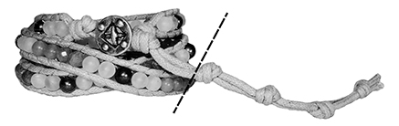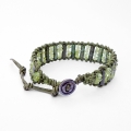 This bracelet will suit a wrist size of 6 - 8.5", is 2 cm wide and closed with an antiqued metal button through knotted leather cord. If preferred, with a small wrist, the excess may be carefully cut away close to the discarded knot, thus leaving a 1.5cm tail.